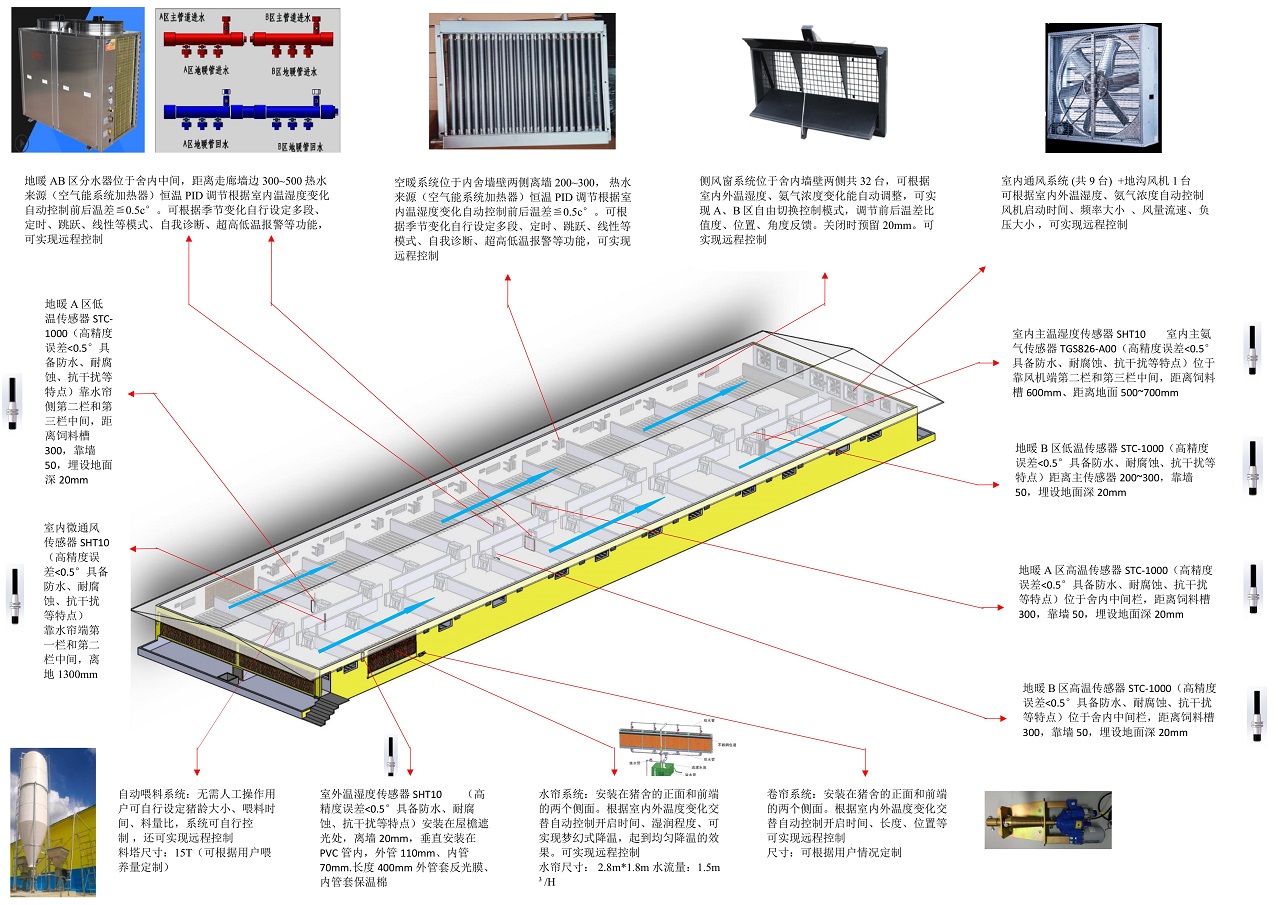 1.4.有室内温湿度传感器和氨气传感器,以及室外温湿度传感器。以便科学地评估室内和室外环境状态,为多个环境指标同时参与控制、平衡各环境指标之间的关系提供数字依据。